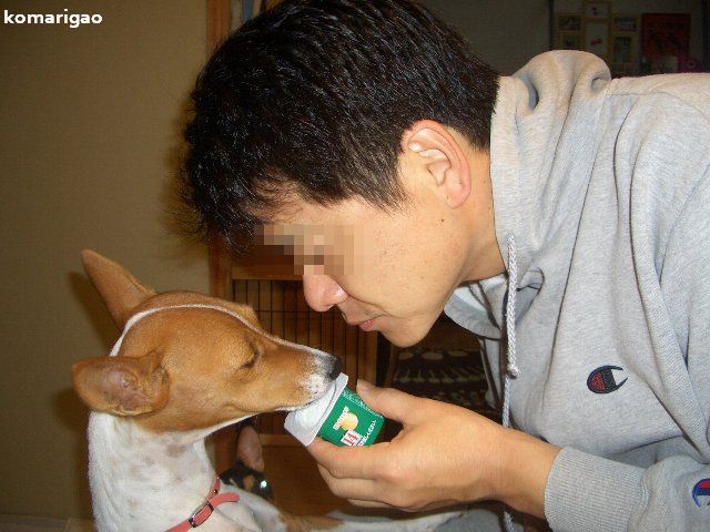 花の気を引くため、ワイロ(ヨーグルトの残り)を貢ぎ中